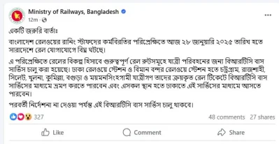 মঙ্গলবার (২৮ জানুয়ারি) সকাল সাড়ে নয়টায় রেলপথ মন্ত্রণালয়ের ফেসবুক পেজে এক জরুরি বার্তায় এই তথ্য জানানো হয়।