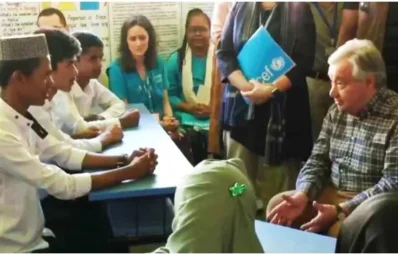 জাতিসংঘ মহাসচিব গুতেরেস বিমানবন্দর থেকে সরাসরি উখিয়ায় যান। দুপুর ২ টায় সেখানে পৌঁছে তিনি ইউনিসেফ পরিচালিত ফেন্সি লার্নিং সেন্টারে অধ্যায়নরত রোহিঙ্গা শিক্ষার্থীদের সঙ্গে কথা বলেন।
