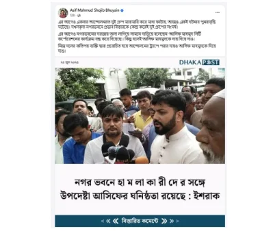তিনি আরও লিখেছেন, ‘এর আগেও একবার আন্দোলনরত দুই গ্রুপ মারামারি করে মাথা ফাটায়, আজও একই ঘটনার পুনরাবৃত্তি ঘটেছে। দখলকৃত নগরভবনে প্রভাব বিস্তারকে কেন্দ্র করেই দুই গ্রুপের সংঘর্ষ। এর আগেও নগরভবনের দরজায় তালা লাগিয়ে সামনে দাড়িয়ে বলেছেন, ‘আসিফ মাহমুদ সিটি করপোরেশনের কার্যক্রম বন্ধ করে দিয়েছে।’