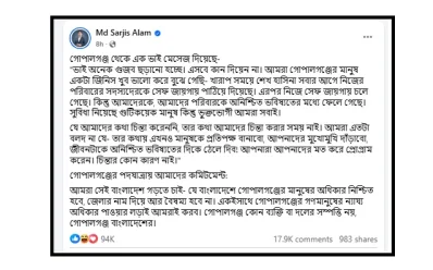 আজ ‘মার্চ টু গোপালগঞ্জ’ কর্মসূচি পালন করবে জাতীয় নাগরিক পার্টি (এনসিপি)। তার আগে ফেসবুকে গোপালগঞ্জ নিয়ে স্ট্যাটাস দিয়েছেন দলের উত্তরাঞ্চলের মুখ্য সংগঠক সারজিস আলম।