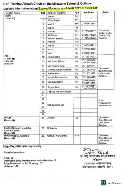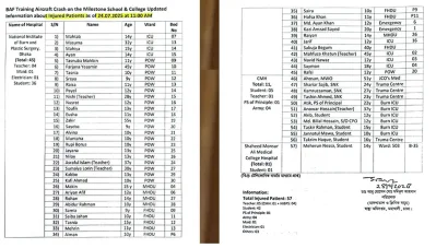 রাজধানীর উত্তরার মাইলস্টোন স্কুল অ্যান্ড কলেজ ক্যাম্পাসে ভয়াবহ বিমান বিধ্বস্তের ঘটনায় ঢাকার বিভিন্ন হাসপাতালে রোগী ভর্তি রয়েছে। এসব ভর্তি রোগীসহ নিহতদের সংখ্যা ও নামের তালিকা প্রকাশ করেছে সরকার।