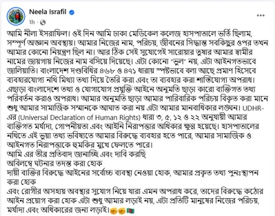 আমি এর তীব্র প্রতিবাদ জানাচ্ছি এবং দাবি করছি- ‘অবিলম্বে ঘটনার তদন্ত করা হোক। দায়ী ব্যক্তির বিরুদ্ধে আইনের সর্বোচ্চ ব্যবস্থা নেওয়া হোক, আমার প্রকৃত তথ্য পুনঃস্থাপন করা হোক এবং রোগীর অসহায় অবস্থার সুযোগ নিয়ে যারা এমন অপরাধ করে, তাদের বিরুদ্ধে কঠোর আইন প্রয়োগ করা হোক এটা শুধু আমার লড়াই নয়, এটা প্রতিটি মানুষের নিজের পরিচয়, মর্যাদা এবং অধিকারের জন্য লড়াই।’