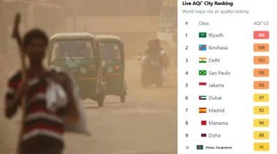 এদিকে, ১৬৬ স্কোর নিয়ে আজ বায়ুদূষণে শীর্ষে রয়েছে সৌদি আরবের রাজধানী রিয়াদ। দ্বিতীয় স্থানে থাকা গণতান্ত্রিক কঙ্গোর রাজধানী কিনশাসার স্কোর ১৪৯। এছাড়াও ১২৩ স্কোর নিয়ে তৃতীয় স্থানে রয়েছে ভারতের রাজধানী দিল্লি এবং ১১৫ স্কোর নিয়ে চতুর্থ স্থানে রয়েছে ব্রাজিলের সাও পাওলো।