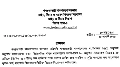 প্রজ্ঞাপনে বলা হয়েছে, গণপ্রজাতন্ত্রী বাংলাদেশের রাষ্ট্রপতি গণপ্রজাতন্ত্রী বাংলাদেশের সংবিধানের ৯৫(১) অনুচ্ছেদ অনুসারে বাংলাদেশের প্রধান বিচারপতির সহিত পরামর্শক্রমে সংবিধানের ১৮ অনুচ্ছেদ মোতাবেক নিম্নের ১-২৫ ক্রমিকে উল্লিখিত ২৫ (পঁচিশ) জন ব্যক্তিকে শপথ গ্রহণের তারিখ হতে অনধিক ২ (দুই) বৎসরের জন্য বাংলাদেশ সুপ্রিম কোর্ট, হাইকোর্ট বিভাগের অতিরিক্ত বিচারক নিয়োগদান করিয়াছেন।