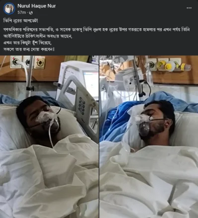 পোস্টে জানানো হয়েছে, নুর আইসিইউতে চিকিৎসাধীন রয়েছেন। সেখানে লেখা হয়, নুরুল হক নুরের ওপর গতরাতে হামলার পর এখন পর্যন্ত তিনি আইসিইউতে চিকিৎসাধীন। এখন তার কিছুটা হুঁশ ফিরেছে। সবাই তার জন্য দোয়া করবেন।