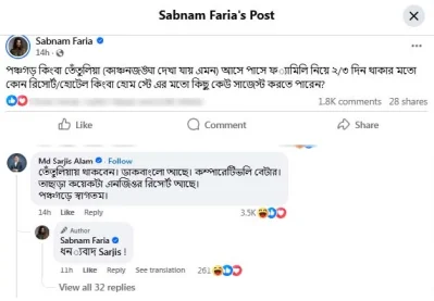 পোস্টটি করার পর মুহূর্তের মধ্যেই নেটিজেনরা বিভিন্ন সাজেশন দিতে শুরু করেন। পঞ্চগড় ও আশপাশের এলাকার একাধিক বাসিন্দা তাদের অভিজ্ঞতা শেয়ার করে অভিনেত্রীকে পরামর্শ দেন।