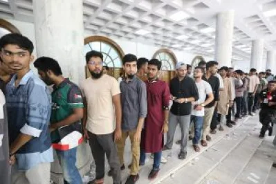 ঢাকা বিশ্ববিদ্যালয় ক্লাব কেন্দ্রে ভোট দিচ্ছেন বাংলাদেশ-কুয়েত মৈত্রী হল ও বঙ্গমাতা শেখ ফজিলাতুন্নেছা মুজিব হলের শিক্ষার্থীরা। এখানে মোট ভোটার সংখ্যা ৪ হাজার ৭৫৫।