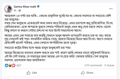 ছোট পর্দার অভিনেত্রী সামিরা খান মাহি মানুষের প্রতি আস্থা হারানো ও সমাজে নানাবিধ কর্মকাণ্ড নিয়ে প্রকাশ করেছেন গভীর উদ্বেগ। শুক্রবার (১২ সেপ্টেম্বর) দুপুরে নিজের ফেসবুক প্রোফাইলে দেওয়া এক আবেগঘন স্ট্যাটাসে তিনি তুলে ধরেন বর্তমান সমাজের পরিবর্তিত চিত্র।