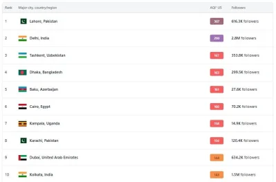 আইকিউএয়ারের সর্বশেষ তথ্যানুসারে, দূষিত শহরের তালিকায় শীর্ষে রয়েছে পাকিস্তানের লাহোর, যার স্কোর ৩৬৭। দ্বিতীয় স্থানে ভারতের দিল্লি (স্কোর ২৯০) এবং তৃতীয় স্থানে উজবেকিস্তানের তাসখন্দ (স্কোর ১৬৭)। ঢাকার পর পঞ্চম স্থানে রয়েছে আজারবাইজানের বাকু, যার স্কোর ১৬১।