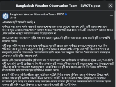 পোস্টে আরও বলা হয়, তেমনি বৃষ্টি বলয় আঁখির তীব্রতা এবং সক্রিয়তা দুটোই নির্ভর করছে ঘূর্ণিঝড় মন্থার গতিপথের ওপরে। তাই আমরা এখনও বৃষ্টি বলয়ের জেলাভিত্তিক আপডেট দেইনি। কারণ বর্তমানে শুষ্ক মৌসুম চলছে। যার ফলে অনেকেই কৃষি কাজসহ নানান কাজ করছেন। এ সময় সামান্য বৃষ্টি হলেও অনেকের ক্ষতি হতে পারে। আবার হালকা বৃষ্টি কৃষি কাজে উপকার ও হতে পারে। কিন্তু ভারি বৃষ্টি হলেই বিপদ।