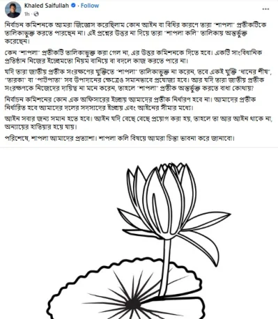 খালেদ সাইফুল্লাহ আরও লিখেছেন, নির্বাচন কমিশনের কোনো এক অফিসারের ইচ্ছায় আমাদের প্রতীক নির্ধারণ হবে না। আমাদের প্রতীক নির্ধারিত হবে আমাদের দলের সদস্যদের ইচ্ছায় এবং আইনের সীমার মধ্যে। আইন সবার জন্য সমান হতে হবে। আইন যদি বেছে বেছে প্রয়োগ করা হয়, তাহলে তা আর আইন থাকে না, অন্যায়ের হাতিয়ার হয়ে যায়।