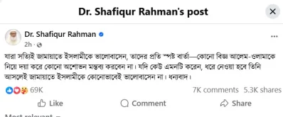 শফিকুর রহমান লিখেছেন, যারা সত্যিই জামায়াতে ইসলামীকে ভালোবাসেন, তাদের প্রতি স্পষ্ট বার্তা- কোনো বিজ্ঞ আলেম-ওলামাকে নিয়ে দয়া করে কোনো অশোভন মন্তব্য করবেন না।