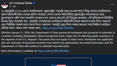 এতে বলা হয়, ‘২১ জানুয়ারি ২০২৬ থেকে কার্যকরভাবে যুক্তরাষ্ট্রের পররাষ্ট্র দপ্তর বাংলাদেশসহ কিছু দেশের নাগরিকদের জন্য অভিবাসী ভিসা দেওয়া স্থগিত করেছে। যেসব দেশের অভিবাসীরা যুক্তরাষ্ট্রের করদাতাদের ব্যয়ে তুলনামূলক বেশি হারে সরকারি সহায়তা নেন, তাদের ক্ষেত্রেই এই সিদ্ধান্ত প্রযোজ্য।’