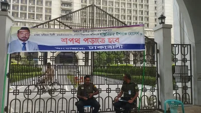 মেয়র হিসেবে ইঞ্জিনিয়ার ইশরাক হোসেনকে শপথ পড়ানোর দাবিতে ঢাকা দক্ষিণ সিটি করপোরেশনের (ডিএসসিসি) প্রধান কার্যালয় নগর ভবনের সব ফটকে তালা লাগিয়ে দেওয়া হয়েছে।