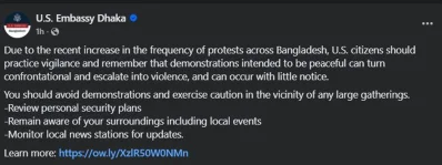 বাংলাদেশজুড়ে বিক্ষোভের সংখ্যা বৃদ্ধি পাওয়ায় মার্কিন নাগরিকদের সতর্ক থাকতে নির্দেশনা দিয়েছে ঢাকায় অবস্থিত মার্কিন দূতাবাস।