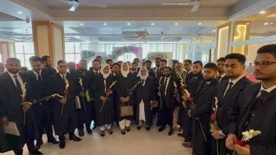 চাঁদপুর জেলায় ২০২৬ ব্যাচের নবীন আইনজীবীদের বরণ, গাউন বিতরণ ও সংবর্ধনা প্রদান করেছে বাংলাদেশ জামায়াতে ইসলামী চাঁদপুর আইনজীবী বিভাগ। গত মঙ্গলবার (২৪ মার্চ) সকালে শহরের চেয়ারম্যানঘাটস্থ ইউরেশিয়া চাইনিজ রেস্টুরেন্টের কনভেনশন হলে এই বর্ণাঢ্য অনুষ্ঠানের আয়োজন করা হয়।