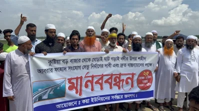 শহীদ আবরার ফাহাদের নামে কুষ্টিয়ায় গড়াই নদীর ওপর ঘোড়াইঘাট থেকে বড়বাজার সংযোগ সেতু স্থাপনের দাবিতে মানববন্ধন করেছে স্থানীয় এলাকাবাসী।