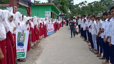 রোববার (২৪ আগস্ট) দুপুরে ওই ছাত্রীর বিদ্যালয়ের সামনে এ মানববন্ধন করা হয়েছে। এতে বক্তব্য রাখেন বিদ্যালয়ের প্রধান শিক্ষক বিজয় কৃষ্ণ বিশ্বাস, সহকারী প্রধান শিক্ষক মাহাবুবুর রহমান, মো. গাফফর শেখসহ কয়েকজন শিক্ষার্থী।