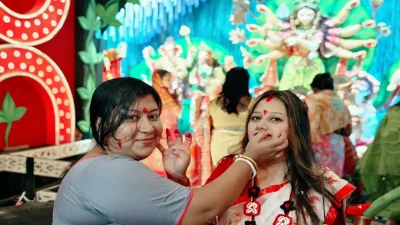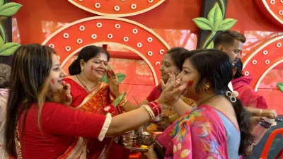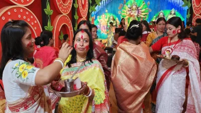 বৃহস্পতিবার (২ অক্টোবর) দুপুর ১টার দিকে পূজা-অর্চনা শেষে ভক্ত নারীরা দেবী দুর্গার চরণে সিঁদুর নিবেদন করে আনন্দে মেতে ওঠেন। এ সময় একে অপরকে সিঁদুর পরিয়ে তারা দেবীর বিদায়ের মুহূর্তকে রঙিন করে তোলেন।
