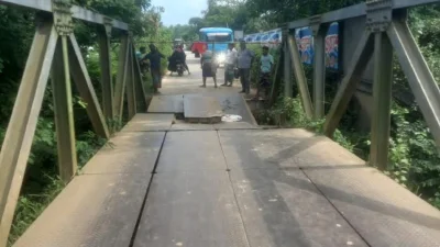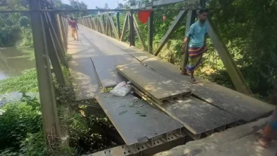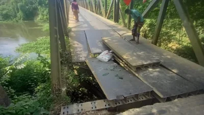 গাজীপুরের শ্রীপুরে কাওরাইদ-জৈনাবাজার সড়কের চৌধুরী ঘাট এলাকায় মাটিকাটা নদীর ওপর নির্মিত বেইলি সেতুর স্টিলের পাত ধসে পড়েছে। সেতুটির ওপর দিয়ে সব ধরনের যান চলাচল বন্ধ রয়েছে। এতে কাওরাইদ ইউনিয়নসহ আশপাশের ১০ গ্রামের কয়েক হাজার মানুষ দুর্ভোগে পড়েছে।