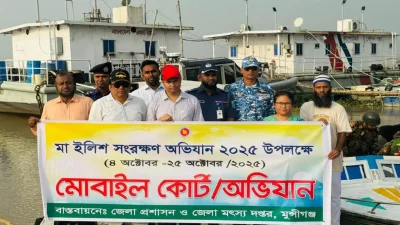 সোমবার (১৩ অক্টোবর) সকাল ৬টা থেকে ১০টা পর্যন্ত নূর বয়াতীর চর সংলগ্ন পদ্মা নদীতে মা ইলিশ সংরক্ষণে এ অভিযান পরিচালনা করে উপজেলা প্রশাসন, সেনাবাহিনী, পুলিশ, উপজেলা মৎস্য অফিস ও কোস্টগার্ডের সদস্যরা।