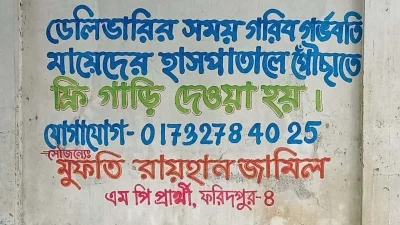 ১০ টাকায় ইলিশ, ১ টাকায় গরুর মাংস আর ২ টাকা কেজিতে চাল বিক্রি করে আলোচনায় আসা ফরিদপুর-৪ আসনের স্বতন্ত্র এমপি প্রার্থী মুফতি রায়হান জামিল এবার ফরিদপুরের চরভদ্রাসন থানার এমকে ডাঙ্গী গ্রামে গরিব ও অসহায় গর্ভবতী মায়েদের হাসপাতালে পৌঁছে দেওয়ার জন্য বিনামূল্যে গাড়ি সেবা চালু করেছেন।