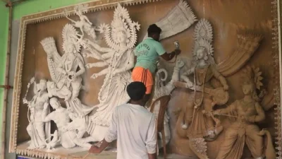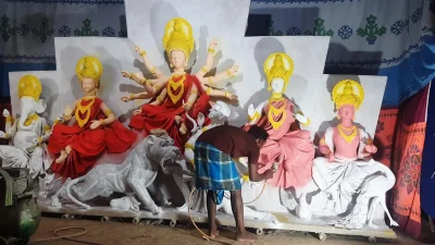 প্রতিমা তৈরির কাজ শেষ। এখন দেবীদুর্গাকে পরিপূর্ণ রুপ দিতে রঙ তুলির আঁচড়ে ব্যস্ত মৃৎশিল্পীরা। স্থানীয় শিল্পী ছাড়াও বিভিন্ন স্থান থেকে আগত শিল্পীরা এখানে রঙ তুলিতে জানান দিচ্ছেন তাদের হাতের নৈপুণ্য। অন্যদিকে প্রতিমার পাশাপাশি বাদ্যযন্ত্র ঠিক ও তৈরি করতে ব্যস্ত সময় পার করছে ঢাক-ঢোল, কাঁশি-বাঁশির কারিগররা। এছাড়া মণ্ডপগুলোতে চলছে সাজসজ্জার প্রস্তুতি। ইতোমধ্যে একাধিক মণ্ডপে প্রতিমায় রঙ তুলির কাজ প্রায় শেষ পর্যায়ে।