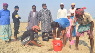 শনিবার (২২ নভেম্বর) সকালে সরেজমিনে দেখা যায়, নবগঙ্গা এলাকার নদীর ওপারে বিশাল চরে প্রায় ২৫০ বিঘা জমি লিজ নিয়েছেন তিনি। প্রজেক্টের অংশ হিসেবে মাটি প্রস্তুতের কাজ ইতোমধ্যে সম্পন্ন। খুলনা থেকে আসা একদল অভিজ্ঞ কৃষক নির্দিষ্ট দূরত্বে সারি সারি বপন করছেন বীজ। কেউ বা দিচ্ছেন পানি ও গোবর সার।