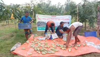 বিরল উপজেলার ২ নম্বর ফরক্কাবাদ ইউনিয়নের সদরডাঙ্গা গ্রামে ‘ব্যানানা’ জাতের আমের বাগান করেছেন কৃষক জুয়েল রানা ও মোমিনুল ইসলাম।