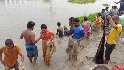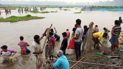ঠাকুরগাঁওয়ের শুক নদীর তীরে বুড়ির বাঁধ এলাকায় মাছ ধরার ধুম পড়েছে। খেপলা জাল, পলো আর মাছ রাখার পাত্র খলই নিয়ে ভোর থেকেই এই এলাকায় জড়ো হতে শুরু করেছেন হাজার হাজার মানুষ। বাঁধের গেট খুলে দেওয়ার পরই মাছ ধরতে নেমে যান শত শত মানুষ। কেউ ভেলায়, কেউ ছোট নৌকায় চলছে মাছ ধরার এক প্রতিযোগিতা। আর বাঁধে দাঁড়িয়ে তাদের উৎসাহ দিয়ে যাচ্ছেন বন্ধু-বান্ধব ও স্বজনরা।