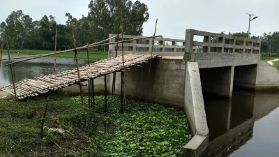 সেতু নির্মাণ শেষ হলেও দুই পাশে সংযোগ সড়ক না থাকায় বিপাকে পড়েছেন ৫ গ্রামের মানুষ। বাধ্য হয়ে স্থানীয়রা বাঁশের মই লাগিয়ে সেতুর সাথে রাস্তার অস্থায়ী সংযোগ তৈরি করেছেন।