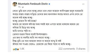 তিনি লিখেছেন, ‘কেন তুমি চলে গেলে আব্বু, কেন চলে গেলে? আজ কালীগঞ্জের মানুষ আহাজারি করছে, রাস্তায় রাস্তায় দাঁড়িয়ে তোমার জন্য মানববন্ধন করছে। আমার এসব দেখেতো অনেক কষ্ট হচ্ছে আব্বু। আব্বু তোমার কি কষ্ট হচ্ছে?’