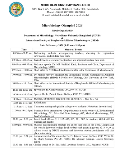 বিজ্ঞান শিক্ষা ও গবেষণায় শিক্ষার্থীদের উৎসাহিত করতে নটর ডেম বিশ্ববিদ্যালয়ে বাংলাদেশে (এনডিইউবি) অনুষ্ঠিত হতে যাচ্ছে ‘মাইক্রোবায়োলজি অলিম্পিয়াড ২০২৬’। আগামী ২৪ জানুয়ারি (২০২৬) বিশ্ববিদ্যালয়ের নিজস্ব ক্যাম্পাসে দিনব্যাপী এই অলিম্পিয়াডের আয়োজন করা হবে।