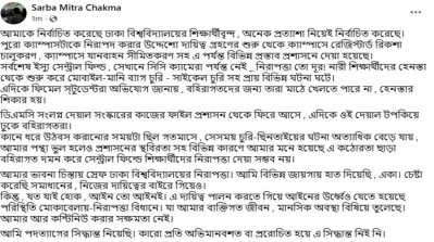 সর্বমিত্র চাকমা জানান, মূলত ক্যাম্পাসের নিরাপত্তা নিশ্চিত করতেই তিনি ব্যক্তিগত উদ্যোগে কাজ করতে চেয়েছিলেন। তিনি বলেন, ‘ঢাকা বিশ্ববিদ্যালয়ের শিক্ষার্থীরা অনেক প্রত্যাশা নিয়ে আমাকে নির্বাচিত করেছিলেন। শুরু থেকেই ক্যাম্পাসকে নিরাপদ করতে রেজিস্টার্ড রিকশা চালুকরণসহ বিভিন্ন প্রস্তাব দিয়েছি। কিন্তু সেন্ট্রাল ফিল্ডে কোনো সিসি ক্যামেরা বা পর্যাপ্ত নিরাপত্তা ব্যবস্থা নেই।’