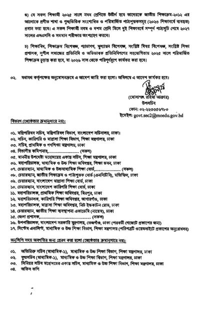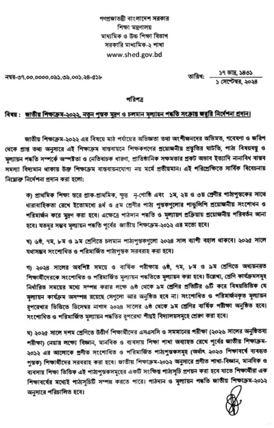 এতে আরও বলা হয়, যেসব শিক্ষার্থী ২০২৫ সালে নবম শ্রেণিতে উত্তীর্ণ হবে, তাদের জাতীয় শিক্ষাক্রম-২০১২ এর আলোকে প্রণীত শাখা ও গুচ্ছভিত্তিক সংশোধিত ও পরিমার্জিত পাঠ্যপুস্তকগুলো (২০২৩ শিক্ষাবর্ষে ব্যবহৃত) প্রদান করা হবে। এসব শিক্ষার্থী নবম ও দশম শ্রেণি মিলিয়ে দুই শিক্ষাবর্ষে সম্পূর্ণ পাঠ্যসূচি শেষে ২০২৭ সালের এসএসসি ও সমমান পরীক্ষায় অংশগ্রহণ করবে।