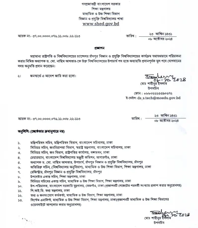 শিক্ষামন্ত্রণালয়ের মাধ্যমিক ও উচ্চ শিক্ষা বিভাগ বিজ্ঞান ও প্রযুক্তি বিশ্ববিদ্যালয় শাখা তাদের ওয়েব সাইটে উপসচিব মো. শাহীনুর ইসলাম স্বাক্ষরিত প্রজ্ঞাপন প্রকাশ করে।
