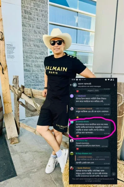 ‘আলো আসবেই’ নামের গ্রুপে মেসেজ ও অবস্থান সম্পর্কে জায়েদ খান বলেন, ‘দেখুন, ওই গ্রুপে আমাকে যুক্ত করা হয়েছে। সেখানে যুক্ত ছিলেন চিত্রনায়ক ফেরদৌস, রিয়াজ, তথ্যপ্রতিমন্ত্রী এ আরাফাত ও সাবেক পররাষ্ট্রমন্ত্রী হাছান মাহমুদ। আমি যদি ওই গ্রুপ ত্যাগ করতাম তাহলে আমাকে রাজাকার বানিয়ে দেওয়া হতো। আপনাকে যদি আপনার অফিসের বস কোনো গ্রুপে যুক্ত করায়, আর আপনি যদি বেরিয়ে আসেন তাহলে আপনার বস কী মনে করবে নিশ্চয়ই বুঝতে পারেন। তবে আমি একদম চুপচাপ ছিলাম, কারণ সেখানে অনেকের সঙ্গেই আমার নীতিগতভাবে দূরত্ব ছিল। আর যেসব বক্তব্য সেখানে পাওয়া গেছে, সেসব আমি সমর্থন করতে পারিনি বলেই চুপ ছিলাম।’