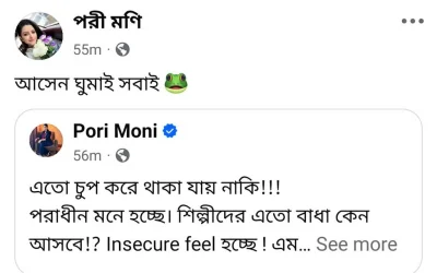 শনিবার (২৫ জানুয়ারি) রাত সাড়ে ১০টায় এক ফেইসবুক পোস্টে ক্ষোভ প্রকাশ করে পরীমনি লেখেন, “এত চুপ করে থাকা যায় নাকি! পরাধীন মনে হচ্ছে। শিল্পীদের এতো বাধা কেন আসবে? ইনসিকিউর ফিল হচ্ছে। এমন স্বাধীন দেশে নিরাপদ নই কেন আমরা।”