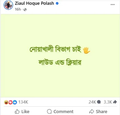পোস্টে জিয়াউল হক পলাশ লিখেছেন, ‘নোয়াখালী বিভাগ চাই, লাউড অ্যান্ড ক্লিয়ার।’