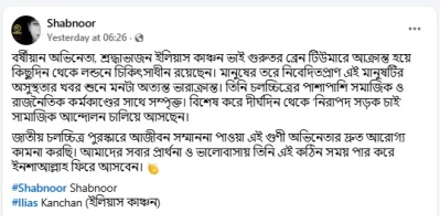 শাবনূর তার বার্তার শেষ অংশে ইলিয়াস কাঞ্চনের দ্রুত আরোগ্য কামনা করে লেখেন, ‘আমাদের ভালোবাসা ও প্রার্থনায় তিনি ইনশাআল্লাহ দ্রুত সুস্থ হয়ে ফিরবেন।’
