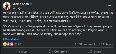 রোববার (৬ এপ্রিল) নিজের ভেরিফাইড ফেসবুকে গাজাবাসীদের নির্যাতন প্রসঙ্গে শাকিব লেখেন, গাজা শুধু একটি ভৌগোলিক নাম নয়, এটি যেন আজ নির্যাতিত মানুষের প্রতীক!