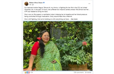 পোস্টে তিনি লেখেন, আমাদের প্রিয় মা বেগম তাহুরা আলী। আমার আম্মু ইউনাইটেড হাসপাতালের হৃদযন্ত্রের নিবিড় পর্যবেক্ষণ কেন্দ্র (সিসিইউ)-তে জীবন-মৃত্যুর সঙ্গে লড়ছেন। গত ১৫ ঘণ্টায় দুইবার বড় ধরনের হার্ট অ্যাটাকে আক্রান্ত হয়েছেন! আমরা তাকে প্রায় হারিয়ে ফেলেছিলাম। কার্ডিওপালমোনারি রিসাসিটেশন (সিসিআর) দিয়ে তাকে আবার জীবিত করা হয়েছে।