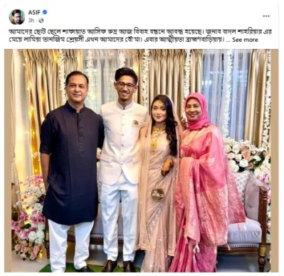 মঙ্গলবার (২৩ ডিসেম্বর) আসিফ তার ফেসবুকে দেয়া স্ট্যাটাসে জানিয়েছেন, তার ছোট ছেলে শাফায়াত আসিফ রুদ্র বিবাহবন্ধনে আবদ্ধ হয়েছেন।
