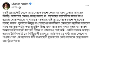ওই ফেসবুক পোস্টে তিনি বলেন, ‘দুবাই এয়ারপোর্ট থেকে আমাদেরকে দেশে ফেরানোর জন্য একান্ত অনুরোধ করছি। আমাদের ফোনও কাজ করছে না। আমাদের আমেরিকা যাবার কথা আমরা যেতে পারবো না যাওয়ার দরকারও নাই আমাদেরকে দেশে পাঠানোর ব্যবস্থা করুন।’