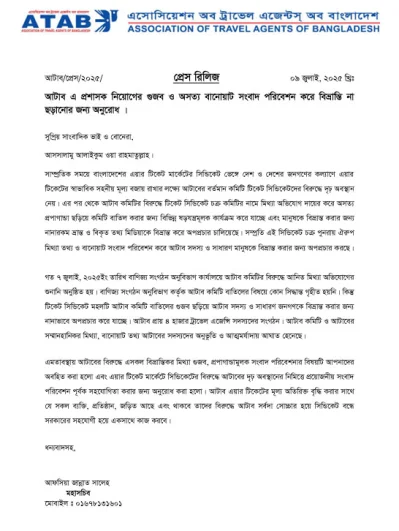 এছাড়া, আটাব অনলাইন লিমিটেডের অর্থ আত্মসাতের যে অভিযোগ তোলা হয়েছে তা সম্পূর্ণ মিথ্যা। টিকেটের বিল চেকের মাধ্যমে প্রদান করা হয়েছে এটাকে আত্নসাৎ বলে মিথ্যা তথ্য প্রচার করা হচ্ছে। এবিষয়ে সব তথ্য বাণিজ্য মন্ত্রণালয়ে জমা দেওয়া আছে। এ ধরনের বিভ্রান্তিকর তথ্য ছড়িয়ে ট্রাভেল শিল্পের স্থিতিশীলতা ও আটাবের সুনাম নষ্ট করা হচ্ছে।