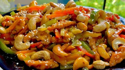 কাজু বাদাম-২৫০ গ্রাম, শসা ২টি, টমেটো ২টি, ক্যাপসিকাম ২টি, পেঁয়াজ ২টি কুচি করে কাটা, কাঁচামরিচ ধনেপাতা কুচি করে কাটা পছন্দমতো, চিকেন ২ কাপ, রসুন কুচি আধাকাপ, টমেটো সস ২ কাপ, সয়াসস আধাকাপ, চিনি ও লবণ পছন্দমতো।