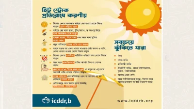 হিট স্ট্রোকের বেশি ঝুঁকিতে থাকেন- শিশু, বয়স্ক, প্রতিবন্ধী ব্যক্তি, শ্রমজীবী ব্যক্তি যেমন রিকশা চালক, কৃষক নির্মাণশ্রমিক। যাদের ওজন বেশি, যারা শারীরিকভাবে অসুস্থ, বিশেষ করে যাদের হৃদরোগ বা উচ্চ রক্তচাপ আছে। হিট স্ট্রোক থেকে বাঁচার জন্য আইসিডিডিআর-বি কয়েকটি পরামর্শ দিয়েছে। চলুন জেনে নেই সেই পরামর্শগুলো।