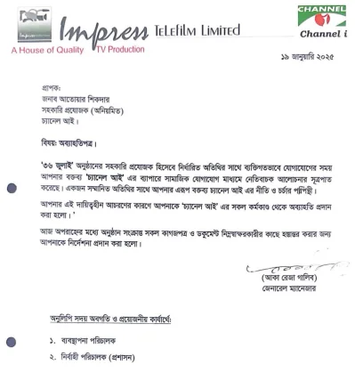 অব্যাহতি পত্রে বলা হয়, ‘৩৬ জুলাই’ অনুষ্ঠানের সহকারী প্রযোজক হিসেবে নির্ধারিত অতিথির সঙ্গে ব্যক্তিগতভাবে যোগাযোগের সময় আপনার বক্তব্য ‘চ্যানেল আই’ এর ব্যাপারে সামাজিক যোগাযোগ মাধ্যমে নেতিবাচক আলোচনার সূত্রপাত করেছে। একজন সম্মানিত অতিথির সঙ্গে আপনার এরূপ বক্তব্য চ্যানেল আই এর নীতি ও চর্চার পরিপন্থী। আপনার এই দায়িত্বহীন আচরণের কারণে আপনাকে ‘চ্যানেল আই’ এর সব কর্মকাণ্ড থেকে অব্যাহতি প্রদান করা হলো।