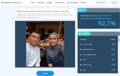ছবিটির সত্যতা সম্পর্কে আরও নিশ্চিত হতে, রিউমর স্ক্যানার টিম ডিপফেক শনাক্তকরণ প্ল্যাটফর্ম হাইভ মোডারেশনে ছবিটি বিশ্লেষণ করে। ওয়েবসাইটটির বিশ্লেষণে দেখা গেছে, ছবিটি এআই প্রযুক্তি ব্যবহার করে তৈরি হওয়ার সম্ভাবনা ৯২%।