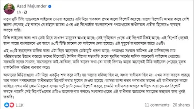টিভি লাইসেন্স কারা পায় সেটা নিয়ে সাধারণ মানুষের আগ্রহ আছে জানিয়ে তিনি লিখেছেন, সেই দৃষ্টিকোণ থেকে এই রিপোর্ট ঠিকই আছে। এই রিপোর্ট থেকেই জানা যাচ্ছে বাংলাদেশে এর আগে ৫০টি টিভি চ্যানেলকে লাইসেন্স দেওয়া হয়েছে। এই মুহূর্তে অপারেশনে আছে ৩৬টি।